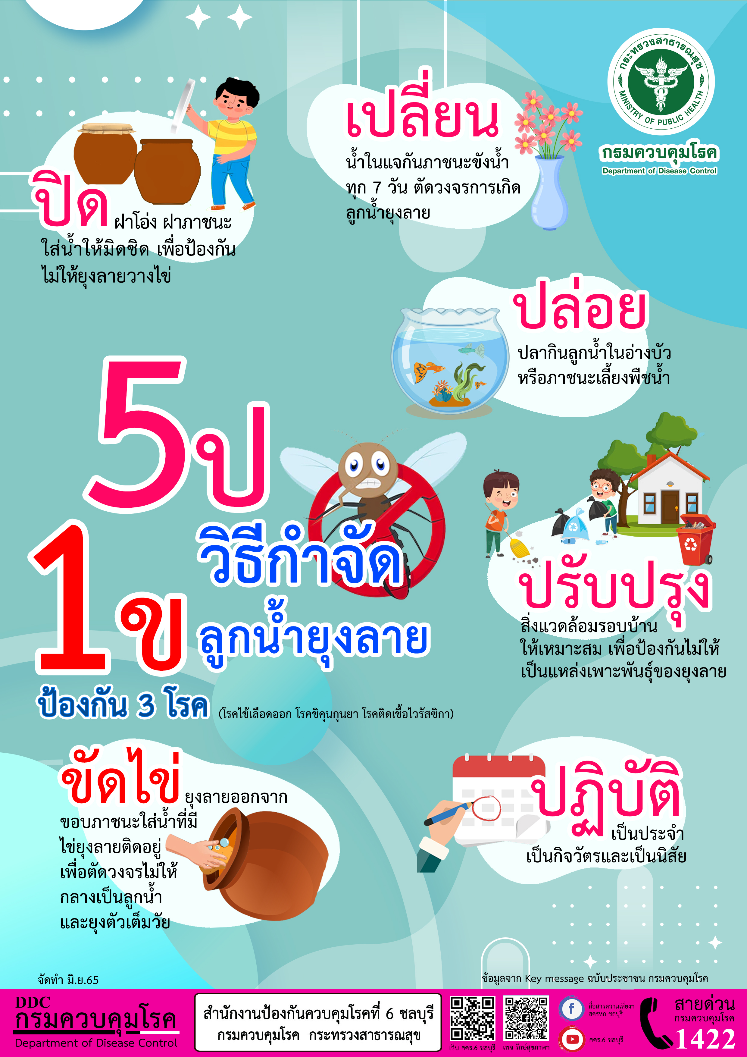 มาตรการ 5ป. 1ข. (ปิด, เปลี่ยน, ปล่อย, ปรับ, ปฏิบัติ, ขัดล้าง) ทุกสัปดาห์ เน้นกำจัดแหล่งเพาะพันธุ์รอบบ้าน ลดความเสี่ยงแพร่ระบาด